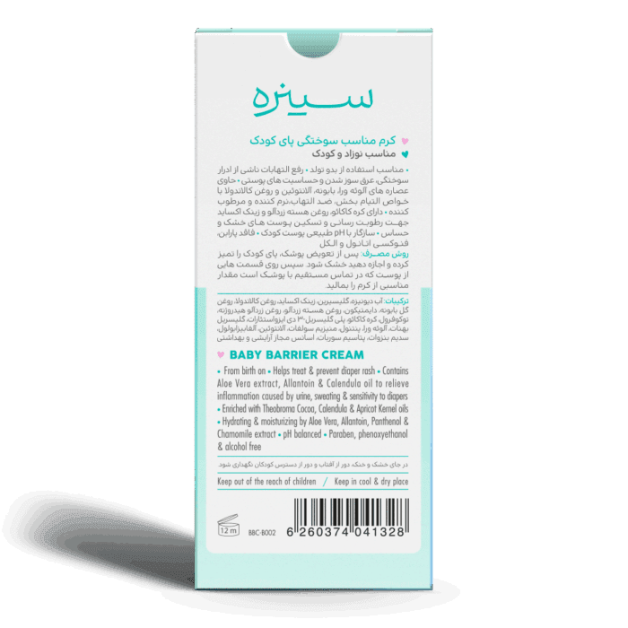 این کرم یک محافظ عالی برای پوست پا و ناحیه پوشک نوزادان می باشد زیرا یک لایه آبگریز روی پوست ایجاد می کند بدون اینکه از رسیدن هوا به پوست جلوگیری کند این کرم قدرت ضدالتهاب بسیار خوبی دارد و در فرمولاسیون آن از روغن کالندولا، عصاره بابونه و آلوئه ورا جهت کاهش التهاب پوست و از بین بردن سوزش و قرمزی منطقه استفاده شده است. روغن هسته زردآلو و کره کاکائو هر دو به سرعت باعث ترمیم پوست منطقه شده و مقاومت پوست در مقابل عوامل خارجی از جمله شوینده ها و مواد موجود در مدفوع و ادرار و . . . را افزایش می دهند. دکسپنتنول و گلیسرین باعث حفظ رطوبت و لطافت پوست شده و به کاهش التهاب کمک می کنند. زینک اکساید موجود در این محصول علاوه بر کاهش سوزش، التهاب و قرمزی پوست، اثر ضد قارچ و ضد باکتری دارد و از طرف دیگر سرعت ترمیم پوست را افزایش می دهد و به بهبود سریع تر پوست کمک می کند