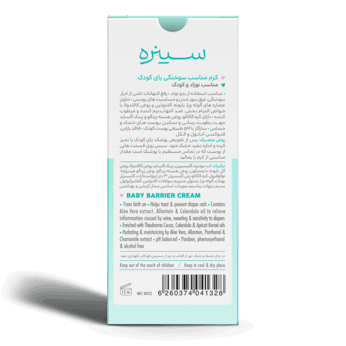 این کرم یک محافظ عالی برای پوست پا و ناحیه پوشک نوزادان می باشد زیرا یک لایه آبگریز روی پوست ایجاد می کند بدون اینکه از رسیدن هوا به پوست جلوگیری کند این کرم قدرت ضدالتهاب بسیار خوبی دارد و در فرمولاسیون آن از روغن کالندولا، عصاره بابونه و آلوئه ورا جهت کاهش التهاب پوست و از بین بردن سوزش و قرمزی منطقه استفاده شده است. روغن هسته زردآلو و کره کاکائو هر دو به سرعت باعث ترمیم پوست منطقه شده و مقاومت پوست در مقابل عوامل خارجی از جمله شوینده ها و مواد موجود در مدفوع و ادرار و . . . را افزایش می دهند. دکسپنتنول و گلیسرین باعث حفظ رطوبت و لطافت پوست شده و به کاهش التهاب کمک می کنند. زینک اکساید موجود در این محصول علاوه بر کاهش سوزش، التهاب و قرمزی پوست، اثر ضد قارچ و ضد باکتری دارد و از طرف دیگر سرعت ترمیم پوست را افزایش می دهد و به بهبود سریع تر پوست کمک می کند