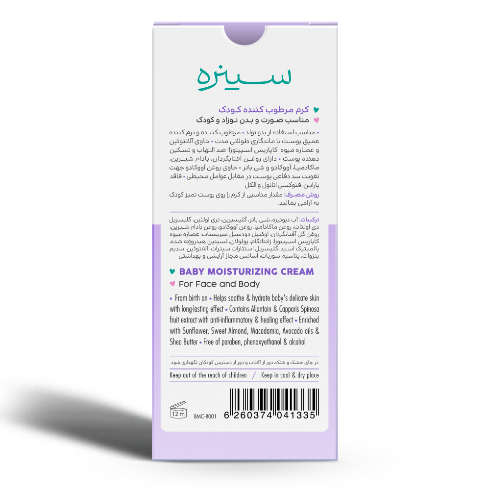 کرم مرطوب کننده کودک سینره برای رفع خشکی پوست صورت و بدن کودکان با بهره گیری از مواد طبیعی طراحی شده است. این کرم دارای مواد طبیعی از جمله روغن ماکادمیا می باشد که به علت محتوای اسیدهای چرب ضروری امگا ۳، ۶ و ۹ نقش موثری در رفع التهاب های پوستی و ترمیم پوست های حساس و آسیب دیده دارند.