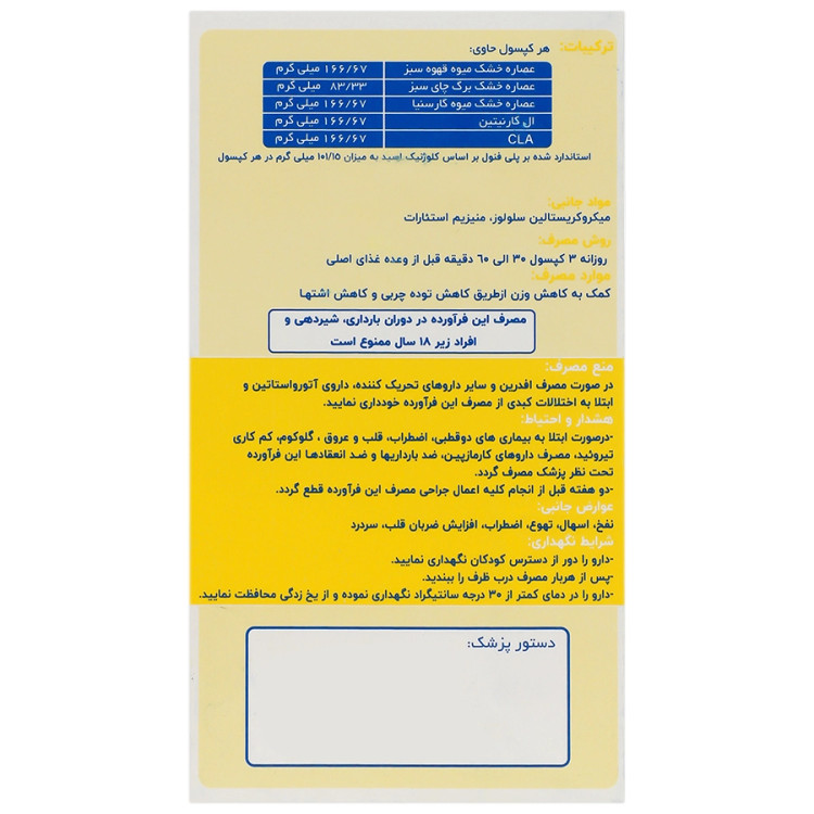 حاوی عصاره چای سبز، قهوه سبز، کامبوجیا و ال کارنیتین و سی ال ای