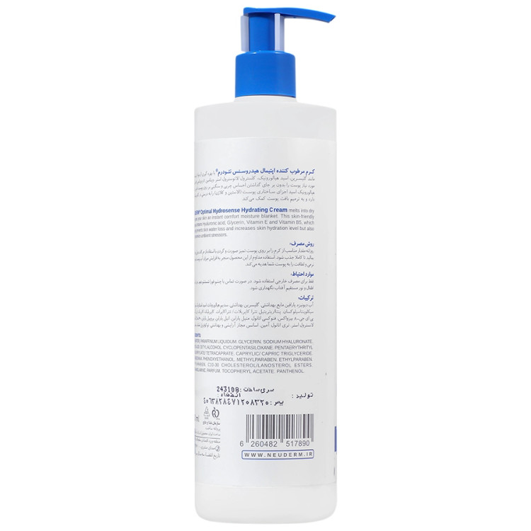 کرم آبرسان و مرطوب کننده اپتیمال هیدروسنس نئودرم یکی از قویترین آبرسان ها و مرطوب کننده هایی است که به راحتی رطوبت مورد نیاز برای پوستهای خشک و بسیار خشک را تامین میکند. این کرم برای استفاده بر روی پوست های نرمال تا خشک مناسب بوده و پس از استفاده، پوست را لطیف و مرطوب میکند. این محصول به سه شکل کاسه ای، پمپی و تیوپی در سه حجم ۵۰، ۱۵۰ و ۴۵۰ میلی لیتر به بازار عرضه شده است.