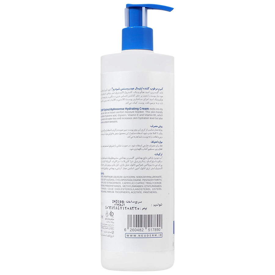 کرم آبرسان و مرطوب کننده اپتیمال هیدروسنس نئودرم یکی از قویترین آبرسان ها و مرطوب کننده هایی است که به راحتی رطوبت مورد نیاز برای پوستهای خشک و بسیار خشک را تامین میکند. این کرم برای استفاده بر روی پوست های نرمال تا خشک مناسب بوده و پس از استفاده، پوست را لطیف و مرطوب میکند. این محصول به سه شکل کاسه ای، پمپی و تیوپی در سه حجم ۵۰، ۱۵۰ و ۴۵۰ میلی لیتر به بازار عرضه شده است.