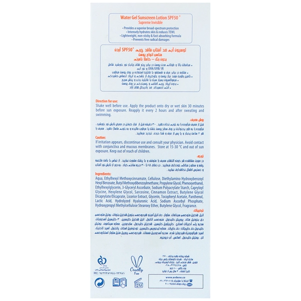 لوسیون ضد آفتاب آردن سولاریس آکوا نیوژن پوست را هیدراته کرده و مانع از خشکی و کشیدگی آن می شود. وجود آنتی اکسیدان ها و ویتامین های E ،C و B5 در این ضد آفتاب، به نحو موثری از آسیب رادیکال های آزاد به پوست جلوگیری می کند.