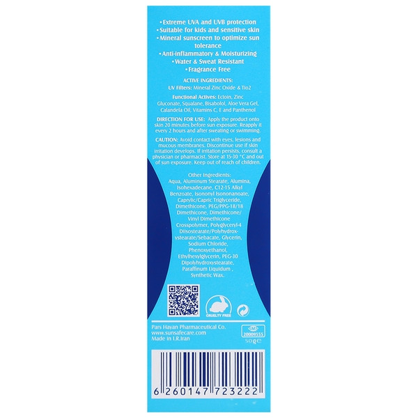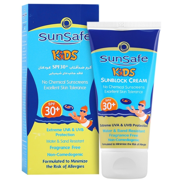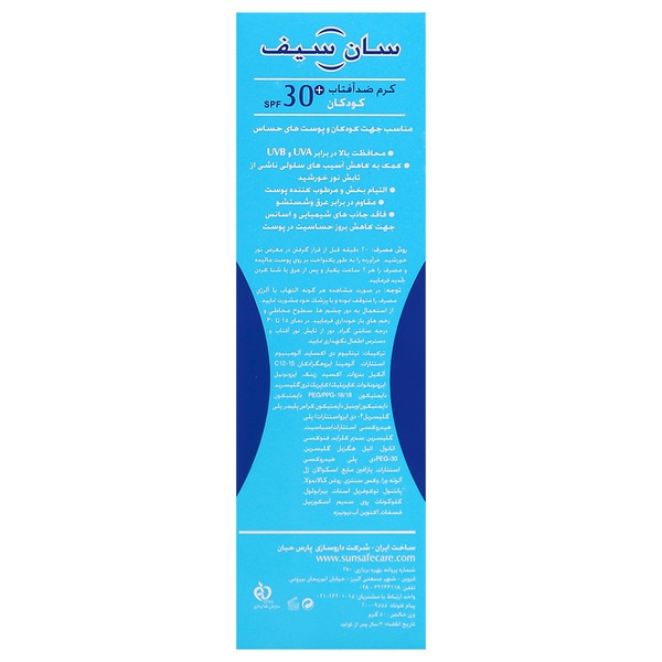 ضد آفتاب کودک سان سیف Spf 30 با فیلتر های فیزیکی از جمله تیتانیوم دی اکساید و زینک اکساید، از پوست در برابر اشعه های مضر نور خورشید محافظت کرده و مانع از آسیب های UVA و UVB بر پوست لطیف کودکان می شود. در فرمولاسیون ضد آفتاب کودک سان سیف، از میکرو ذرات کروی پلیمری به منظور افزایش قدرت اثرگذاری محصول استفاده شده است و بهترین عملکرد را در محافظت از پوست دارد.